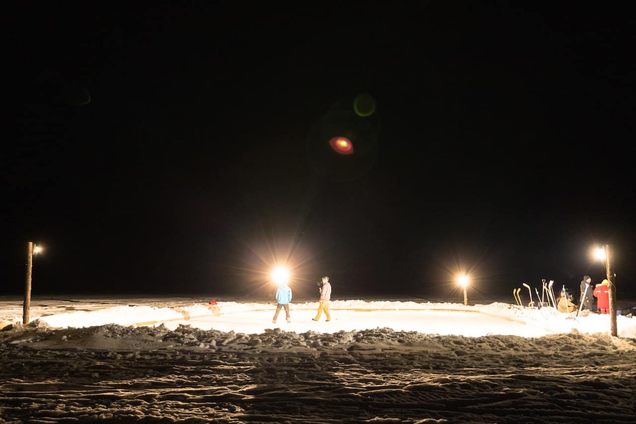 One of the simple pleasures of the trip. The ice was thick and solid, and we spent time just wandering, taking in the mountain views and the vast expanse of white. The resort also clears a section for ice skating and provides skates.